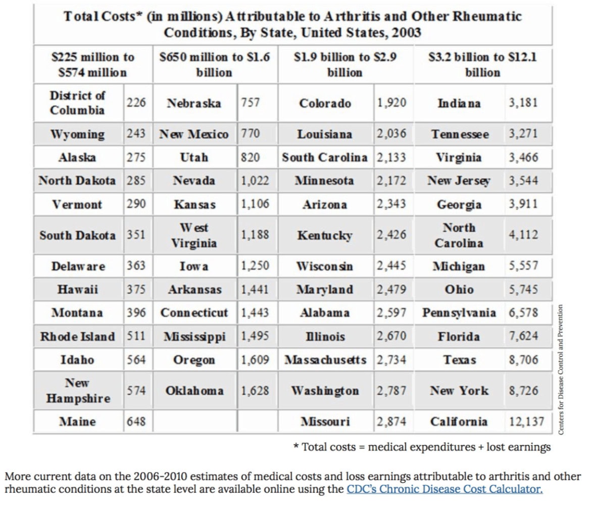 The economic burden of arthritis is taking its combined toll on individuals and the nation. In 2003, medical expenditures and lost wages due to arthritis were approximately $128 billion as reported in the CDC's Morbidity and Mortality Weekly Report (MMWR). That statistic is equivalent to 1.2 percent of the U.S. gross domestic product for 2003. Some forms of arthritis, such as rheumatoid arthritis, tend to be progressive in nature. This means that the symptoms worsen over time. These diseases have a long term impact on the lives of those affected, which translates into considerable social and economic costs. A 2009 study concluded as many as one-third of rheumatoid arthritis sufferers are forced to stop work within ten years of being diagnosed. The table below compiled by the CDC shows the total costs* (in millions of dollars) attributable to arthritis and other rheumatic conditions for each state in 2003.