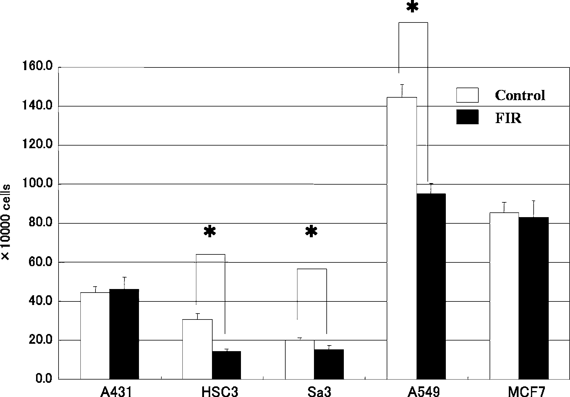 FIR irradiation selectively inhibits the growth of specific cancer cell lines To clarify the effect of FIR irradiation on the proliferation of cancer cell lines, we irradiated five cancer cell lines (A431, HSC3, Sa3, A549, and MCF7) with FIR and measured the number of live cells by Trypan blue dye exclusion. Although the proliferation of HSC3, Sa3, and A549 cells were significantly suppressed on day 8 of cul- ture (45.75%, 74.63%, and 65.79%, respectively), FIR irradiation had little effect on the growth of A431, or MCF7 cells (Fig. 1).