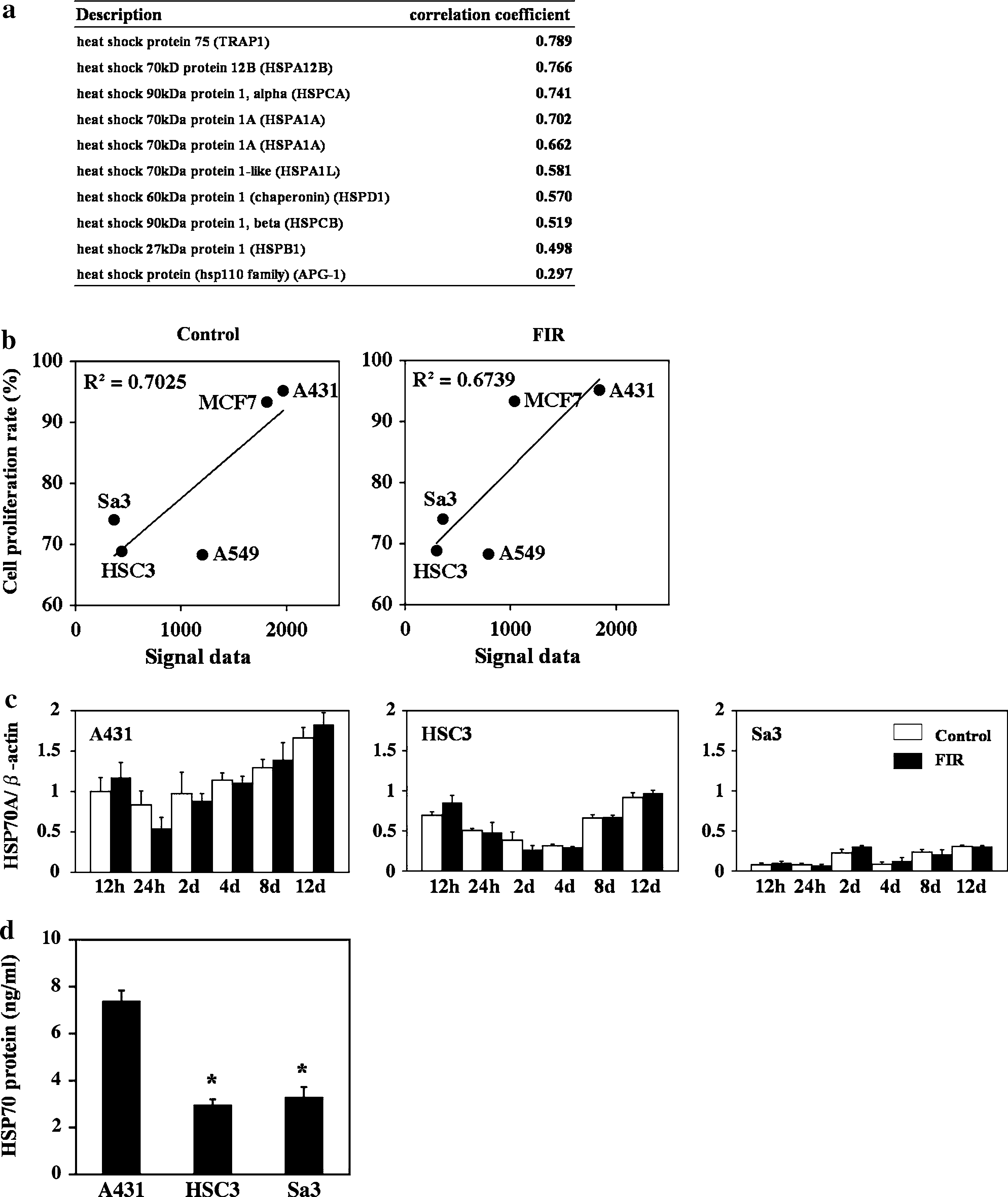 Fig. 2 Relationship between the expression of HSP70 and the suppression of proliferation by FIR irradiation. (a) Correlation between the signal from the microarray for the HSP family members in the control group and the correlation coefficient. (b) Correlation between the signal from the microarray for HSP70 and the growth rate in the control and the FIR-treated cells. (c) Expression of HSP70A mRNA in A431, HSC3, and Sa3 cells after 0.5, 1, 2, 4, 8, and 12 days of culture. The level of these mRNAs was determined by quantitative real-time RT- PCR. Bars represent the means and error bars the SD from three independent experiments. (d) Level of HSP70 protein on day 4 of culture. The concentration of HSP70 protein was measured by ELISA. Bars represent the mean, and error bars the SD (n = 4). *P \ 0.01 vs. to A431 cells