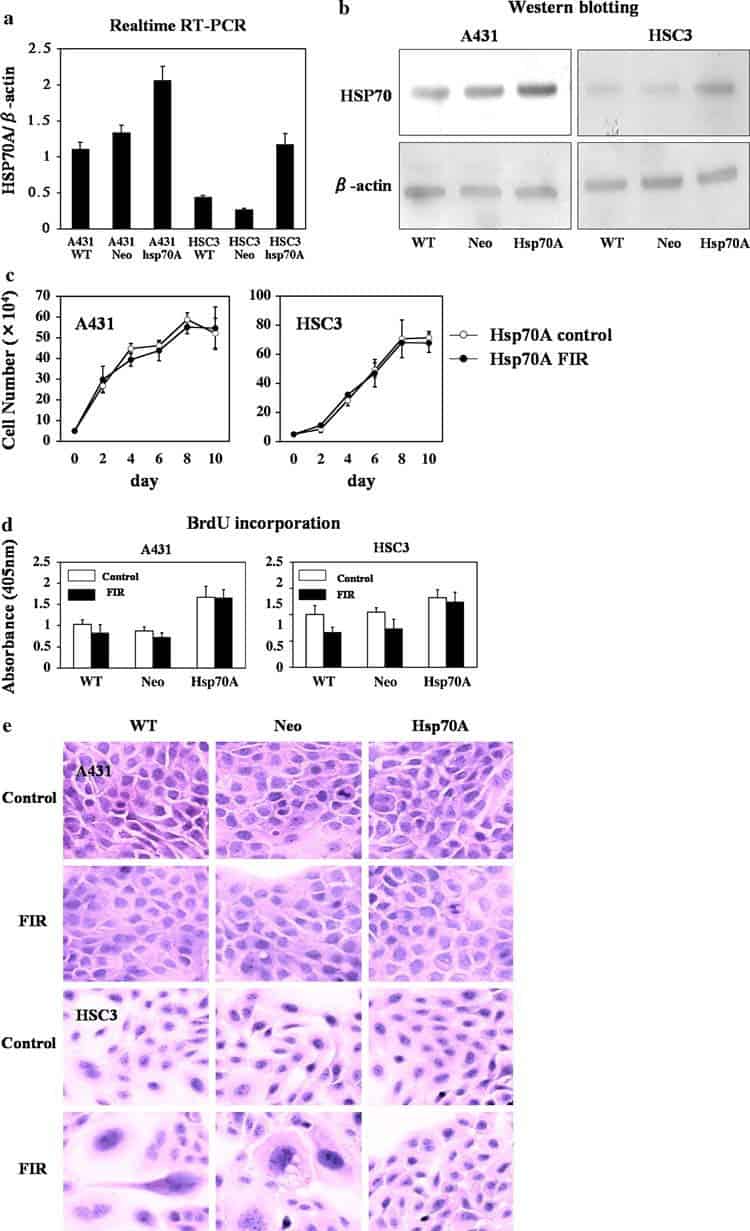 Cell proliferation was the same in FIR-irradiated and untreated A431 cells overexpressing HSP70. In contrast, in HSC3 cells, over expression of HSP70 prevented FIR inhibition of cell proliferation. (d) BrdU incorporation in wild-type, empty vector-transfected, and HSP70-overexpressing cells treated with FIR. (e) Hematoxylin and eosin staining of wild-type, empty vector-transfected, and HSP70A- overexpressing A431 and HSC3 cells after 5 days of transfection. Note that the morphology of HSP70A- transfected HSC3 cells was unaffected by FIR irradiation
