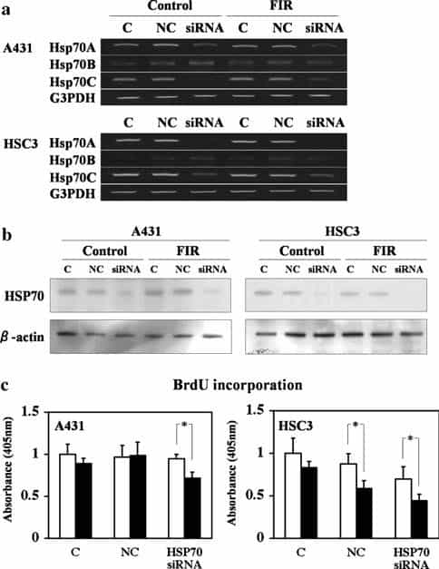 decreased HSP70A and HSP70C mRNA (Fig. 4a) and protein levels (Fig. 4b) in both A431 and HSC3 cells without affecting the level of HSP70B mRNA or protein. HSP70A/C siRNA did not suppress BrdU incorporation in unirradiated A431 cells, but it suppressed BrdU incorpo- ration in cells irradiated with FIR (Fig. 4c). Similarly, the HSP70A/C siRNA enhanced the suppression of BrdU incorporation by FIR irradiation. FIR irradiation also significantly suppressed BrdU incorporation in HSC3 cells transfected with the negative control siRNA (Fig. 4c). These results indicate that a decrease in HSP70 protein mediates the ability of limited FIR to inhibit the prolifer- ation of A431 and HSC3 cells.