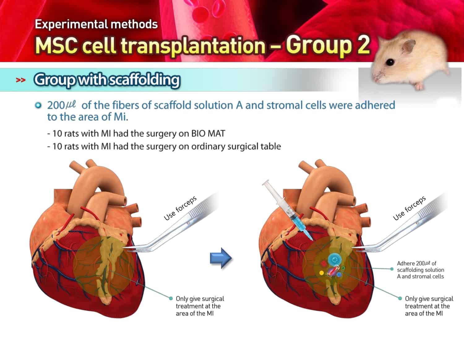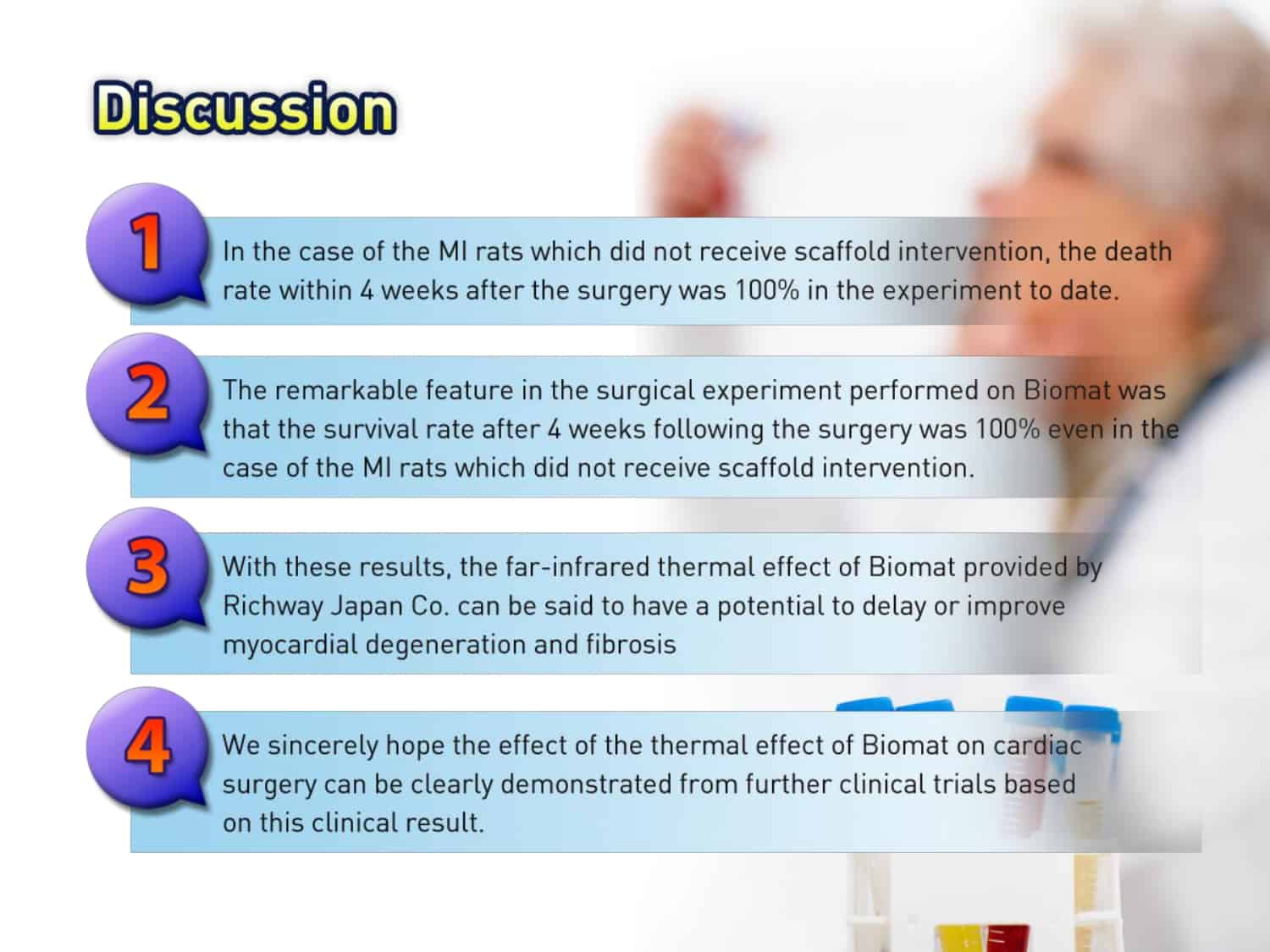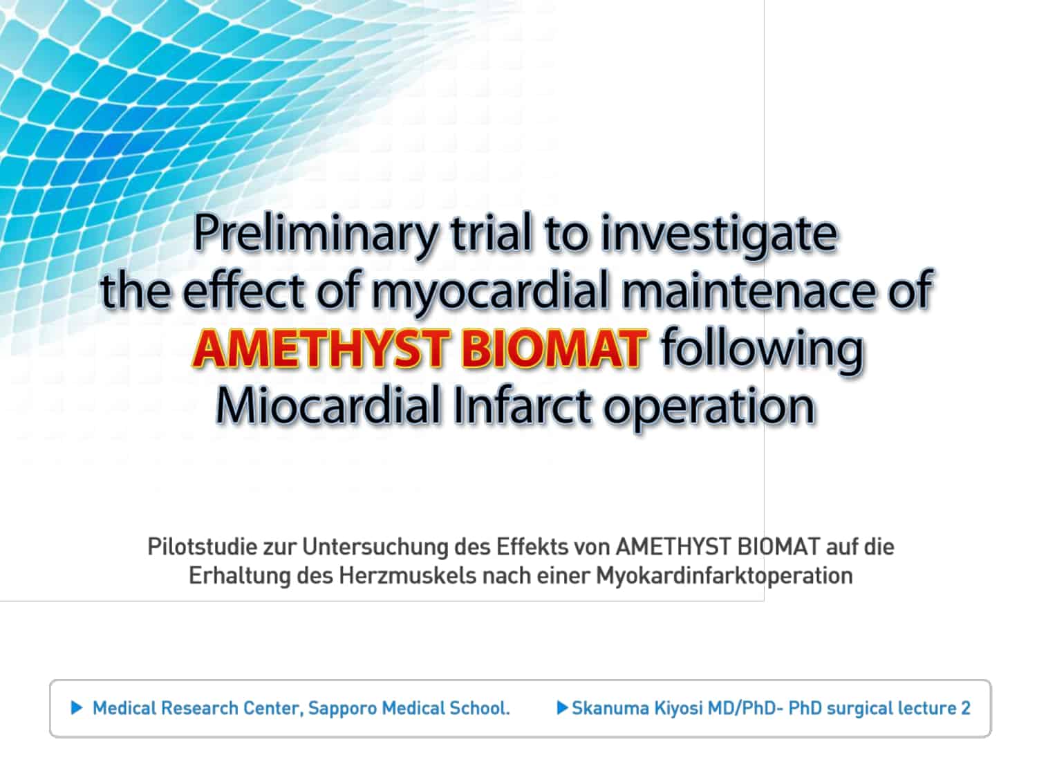 The Sapporo Medical College in Japan conducted a test on mice where they performed a heart surgery utilizing the BioMat. The report shows an increase in longevity when the heart surgery was performed on the BioMat